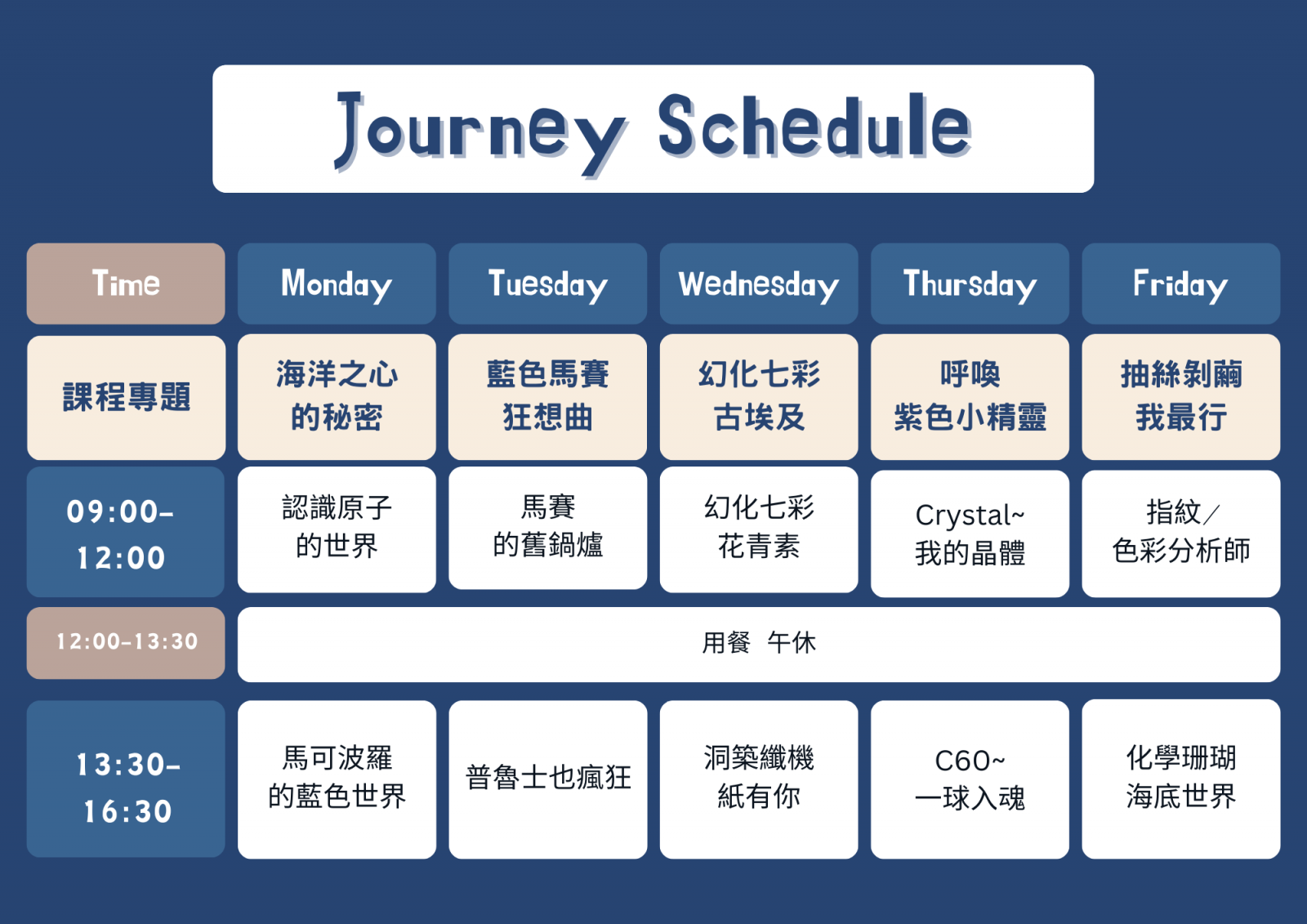 3. 以「海洋之心的祕密、藍色馬賽狂想曲、呼喚紫色小精靈、幻化七彩古埃及、抽絲剝繭我最行」5天5大專業主題,以實作科學題目為主,挑戰完成任務。