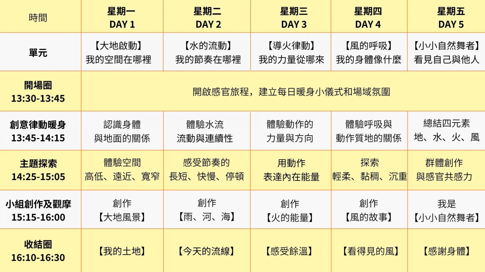 課程以「五感開啟」為核心,每一天都從暖身、遊戲、感知探索到創作呈現,讓孩子在動作與想像之間,體驗身體與自然的連結,找到自信與表達力。