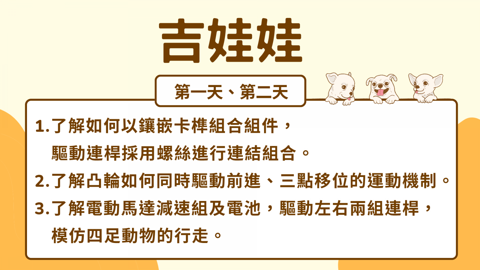 吉娃娃兩側採連桿結構,兩側輪狀連桿以相位差180度,單圈旋轉可以完成單足抬腳及三腳移位的動作,維持身體的重心平衡,連續運動就如同模仿狗狗的昂首跨步的走路方式。課程同時包含凸輪及連桿原理的教學,讓學童能將課程所學與學校進度產生連結,加深印象增強學習成效。