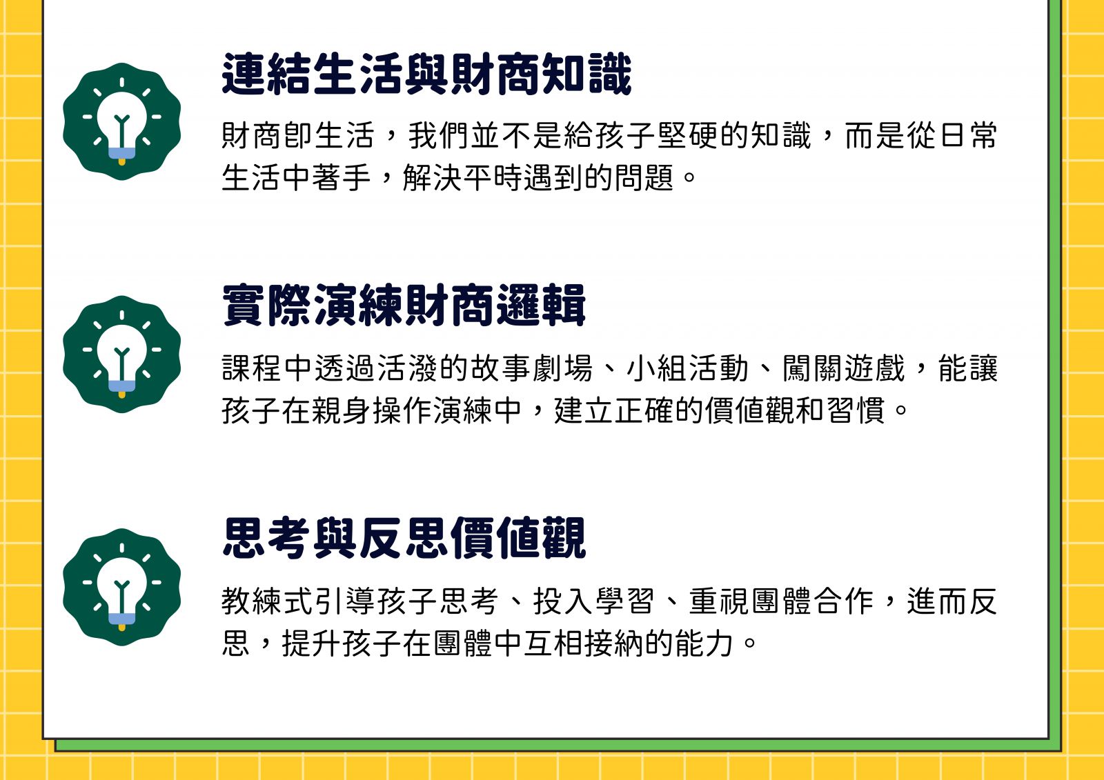在這堂課裡,我們將帶孩子從「玩得開心」走向「用得聰明」,透過精心設計的愛瑪尼財商桌遊,引導孩子學會存錢、花錢、賺錢、投資與捐贈,從生活中的真實情境出發,打造他們未來人生的財商基礎,玩出屬於自己的幸福藍圖!