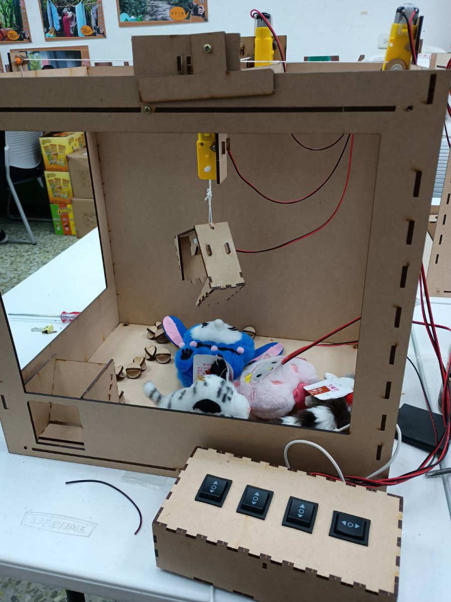 夾娃娃機課程的學習目標在於讓小朋友在自己打造時下流行的夾娃娃機過程中,深入理解數位工具的X、Y、Z軸運作原理、6腳自彈回開關如何控制馬達正反轉,並透過力矩作用讓夾爪工成功夾取扭蛋。