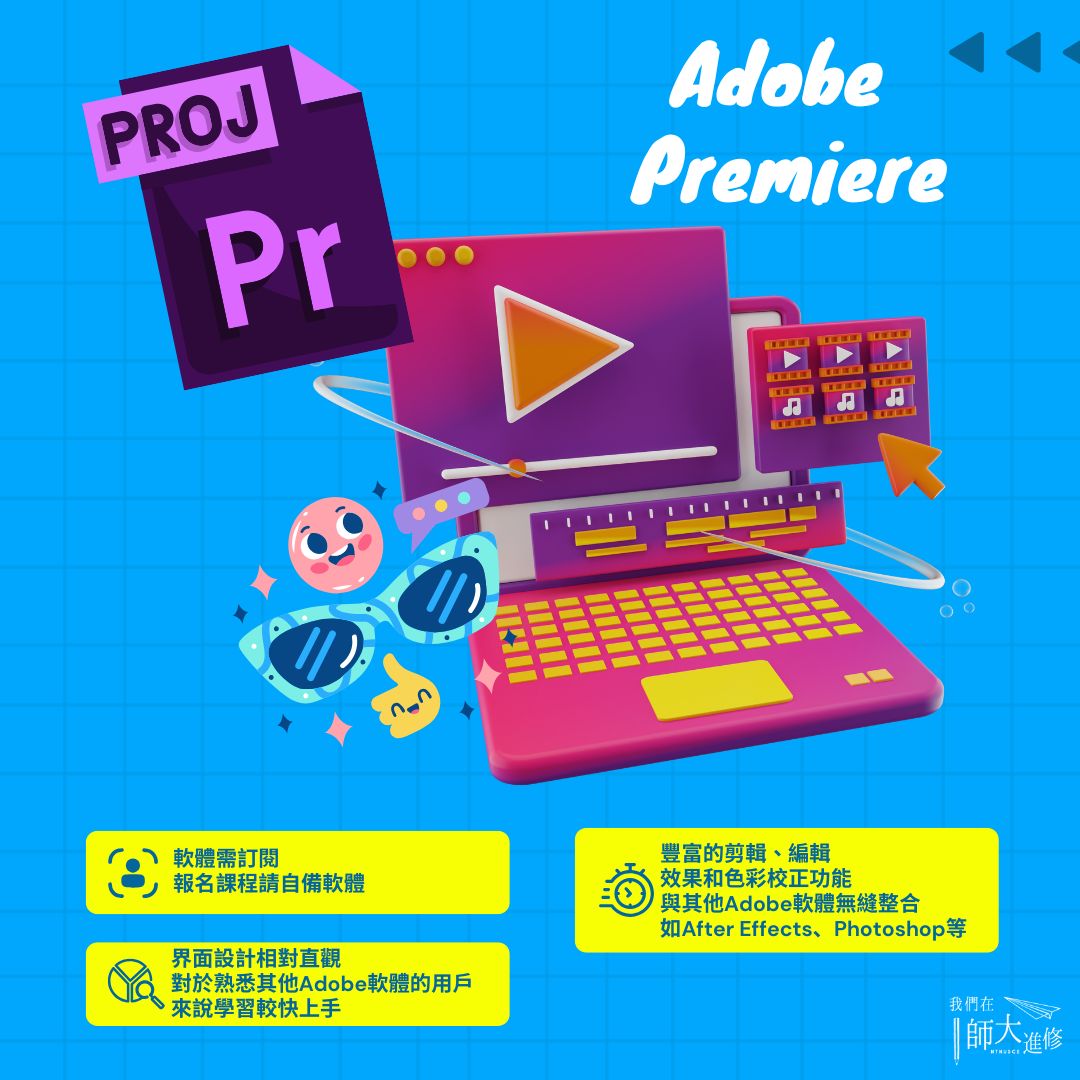 - 本課程以 Adobe Premiere Pro為核心工具,具備高度彈性與穩定性,廣泛應用於電影、廣告與YouTube創作等領域。