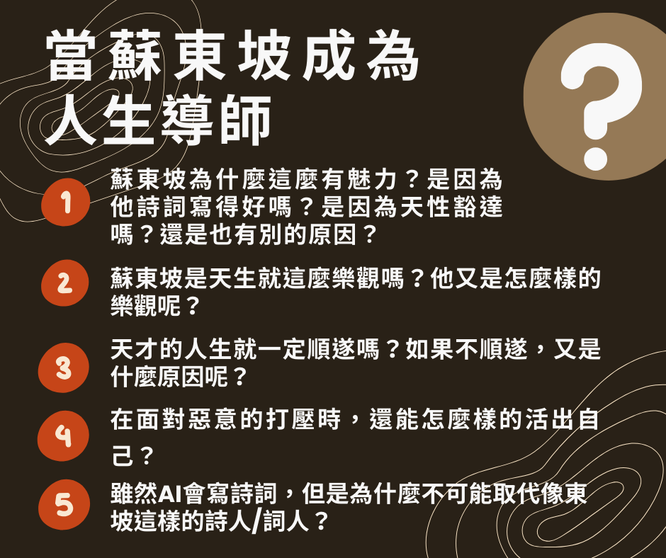 在課程中,我們可以聆聽到許多東坡的故事和心路歷程,更能了解到他的人格魅力,以及堅持也支持了他一輩子的信念。同時,也能深入理解,怎樣在無常的人生中,仍能抱持對生活的熱情,活出自己。