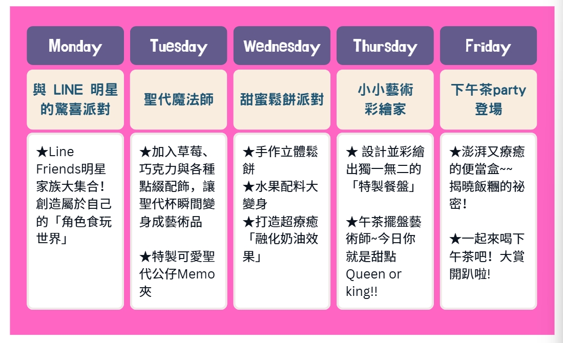 - 每日上午與全日營報到為 08:10起;下午營報到為13:10起、下課接送最晚為18:00;上午半日營接送時間最晚為12:30。