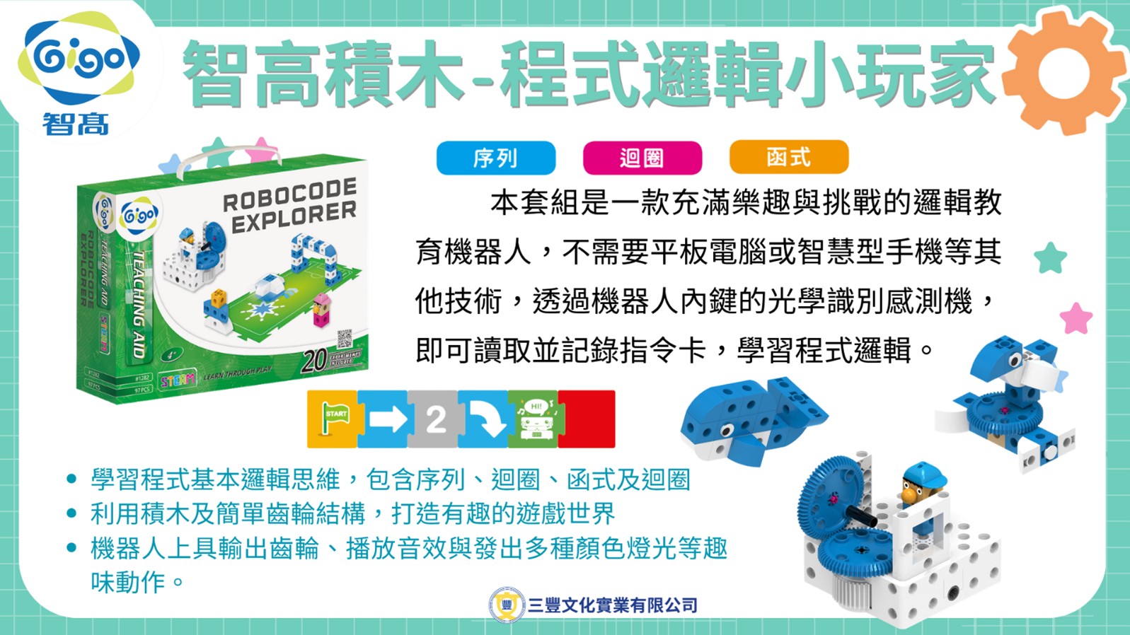 本產品包括108張指令卡、16張地圖卡、3張基地卡與各式智高積木,孩子們可親自組裝如鯨魚、孔雀、足球員等互動式主題課程,學習序列、迴圈與函式的基礎概念。